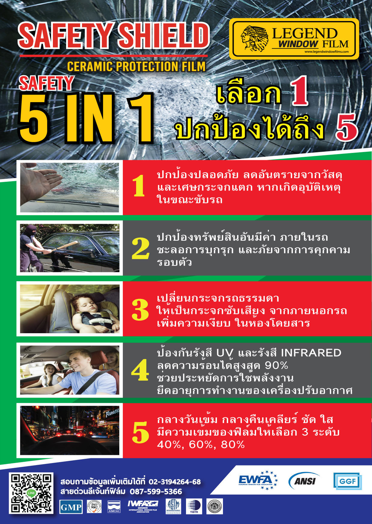 Protect assets And safety Ensure you ... throughout the journey to help absorb shock and prevent danger from broken glass fragments. Has outstanding features in reducing heat And prevent ultraviolet radiation Car safety light film Manufactured from high grade polyester with technology "Micro Layer Polyester" which is a specific license Is a production by using thin, woven polyester, overlapping up to 26 layers, thus making the car safety light film Having outstanding features than other films of the same thickness