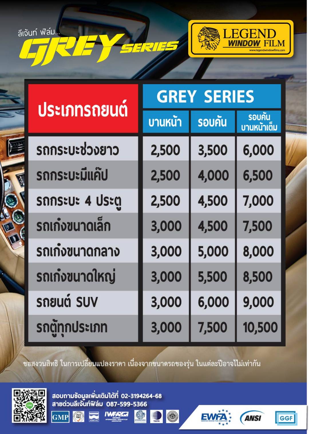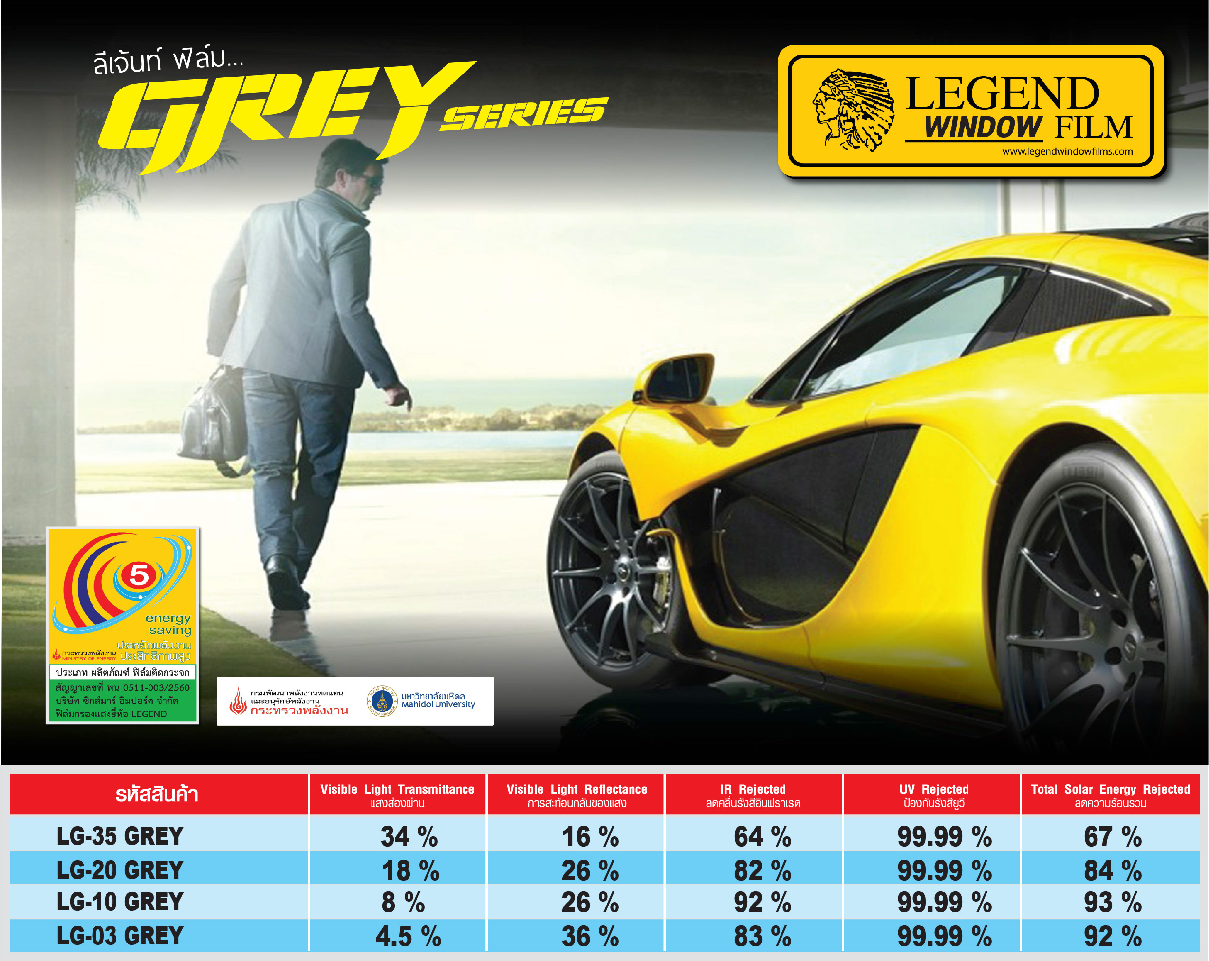 Grey series คือรหัสฟิล์มที่เป็นที่นิยมมาโดยตลอด ผลิตด้วยนวัตกรรม Metal Sputtering โดยใช้อนุภาคโลหะมาติดบนแผ่นฟิล์ม โพลีเอสเตอร์คุณภาพสูงจาก USA. ทำให้ตัวฟิล์มสามารถป้องกันและสะท้อนความร้อนได้ดี สูงถึง 95 % แต่ยังให้ทัศนวิสัยในการมองเห็นได้เป็นอย่างดี เนื้อสีของฟิล์มถูกออกแบบมาเพื่อ ให้เข้ากับสีรถได้หลากหลาย ไม่ว่าจะเป็นรถสีเข้มหรือสีอ่อน มีความเงาจากเนื้อฟิล์มที่ทำให้รถคุณ มีความเป็นส่วนตัวมากขึ้น จึงเป็นที่นิยมมากที่สุดจนถึงปัจจุบัน