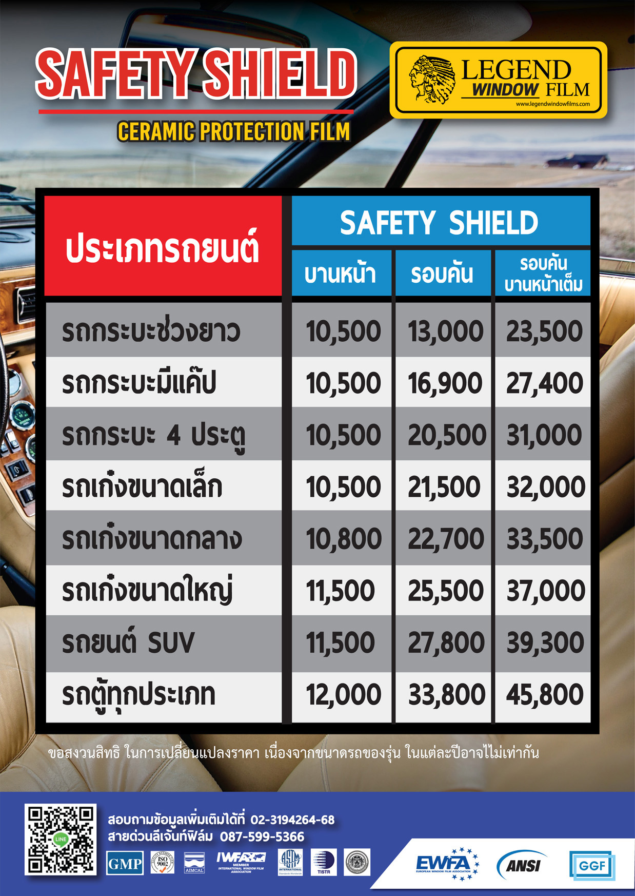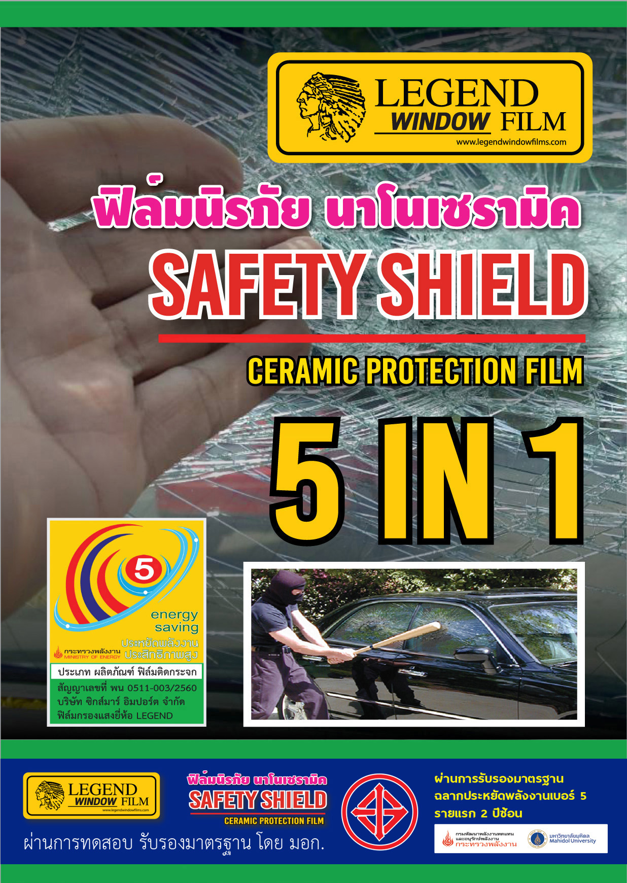 ลีเจ้นท์ ฟิล์มนิรภัย ด้วยเทคโนโลยีขั้นสูงในการผลิต โดยกรรมวิธีประสานฟิล์มให้เป็นเนื้อเดียวกัน จึงได้เนื้อฟิลม์ที่มีความหนา 4 Mil. 7 Mil. มีคุณสมบัติการยึดเกาะสูง ปกป้องภัยจากเหตุการณ์ที่อาจเกิดขึ้นโดยไม่คาดคิด ภัยจากโจรกรรมทรัพย์สิน ในรถยนต์, บ้านและอาคาร ยังสามารถใช้เป็นฟิล์มกรองแสงลดความร้อนไปในตัวอีกด้วย จึงทำให้ประหยัดค่าใช้จ่ายไปได้เยอะ