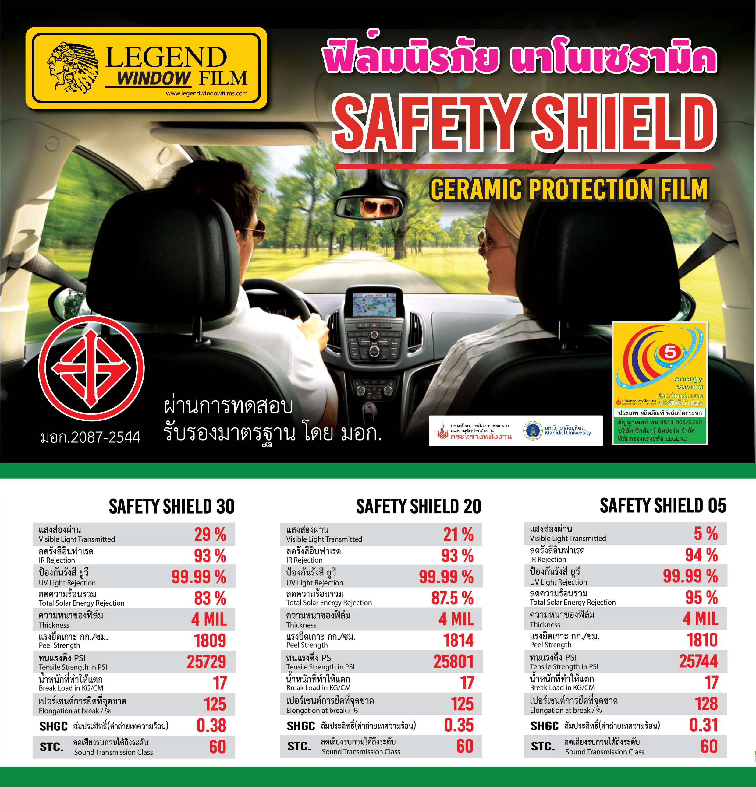 “ปกป้องทรัพย์สิน และความปลอดภัย ให้คุณมั่นใจ...ตลอดการเดินทาง ช่วยดูดซับ แรงกระแทก และป้องกันอันตรายจากเศษกระจกที่แตกกระจาย มีคุณสมบัติเด่นในด้านการลดความร้อน และป้องกันรังสีอัลตร้าไวโอเลต ฟิล์มกรองแสงนิรภัยรถยนต์ ผลิตจากโพลีเอสเตอร์เกรดสูงด้วยเทคโนโลยี “ไมโครเลเยอร์โพลีเอสเตอร์” ซึ่งเป็นลิขสิทธิ์เฉพาะ คือเป็นการผลิต โดยการ นำโพลีเอสเตอร์ บางๆ ถักทอซ้อนกันสูงสุดถึง 26 ชั้น จึงทำให้ฟิล์มกรองแสงนิรภัยรถยนต์ มีคุณสมบัติโดดเด่นกว่าฟิล์มอื่นๆที่มีความหนาเท่ากัน